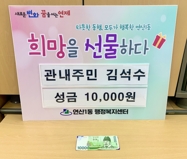 관내주민 김석수씨, 이웃돕기 성금 기탁 > 연산1동